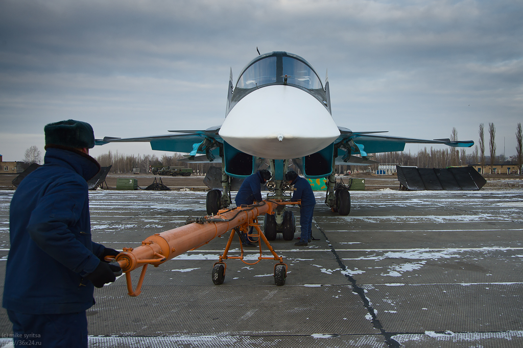 Вторая эскадрилья Су-34 dmitrydreamer 11 февраля, 19:00 Ровно через месяц после прошлогоднего пополнения 25 января 2013 года на аэродром Балтимор прибыла заключительная пятерка Су-34, тем самым, завершив формирование второй эскадрильи этих фронтовых бомбардировщиков. На воронежской авиабазе находятся 20 самолетов этого типа. 31 января летчики второй эскадрильи впервые подняли свои машины в воздух. В настоящее время в задачах экипажей значится отработка взлета и посадки, вылеты на полигон, а также взаимодействие экипажей в воздухе. - 23 фотографии, общий вес 3,0 мегабайта В течение года экипажи 2-й эскадрильи выполнят свыше 200 вылетов на боевое применение на полигонах Воронежской, Тверской и Ленинградской областей. Будут производить бомбометание, пуски ракет и отрабатывать дозаправку в воздухе. http://dmitrydreamer.livejournal.com/41295.htmlНовые Су-34Морозным днем 25 декабря 2012 года на воронежский аэродром Балтимор прибыла очередная пятерка новеньких Су-34. Год назад база уже принимала новые «сушки». Кому интересны технические подробности, что это за зверь такой Су-34, отсылаю вас к моему прошлому обзору. Этот прилет оказался более фотогеничным, нежели таковой годичной давности — погода в этот раз была ясная и морозная. 22 фотографии, общий вес 3,0 мегабайта http://dmitrydreamer.livejournal.com/40237.html