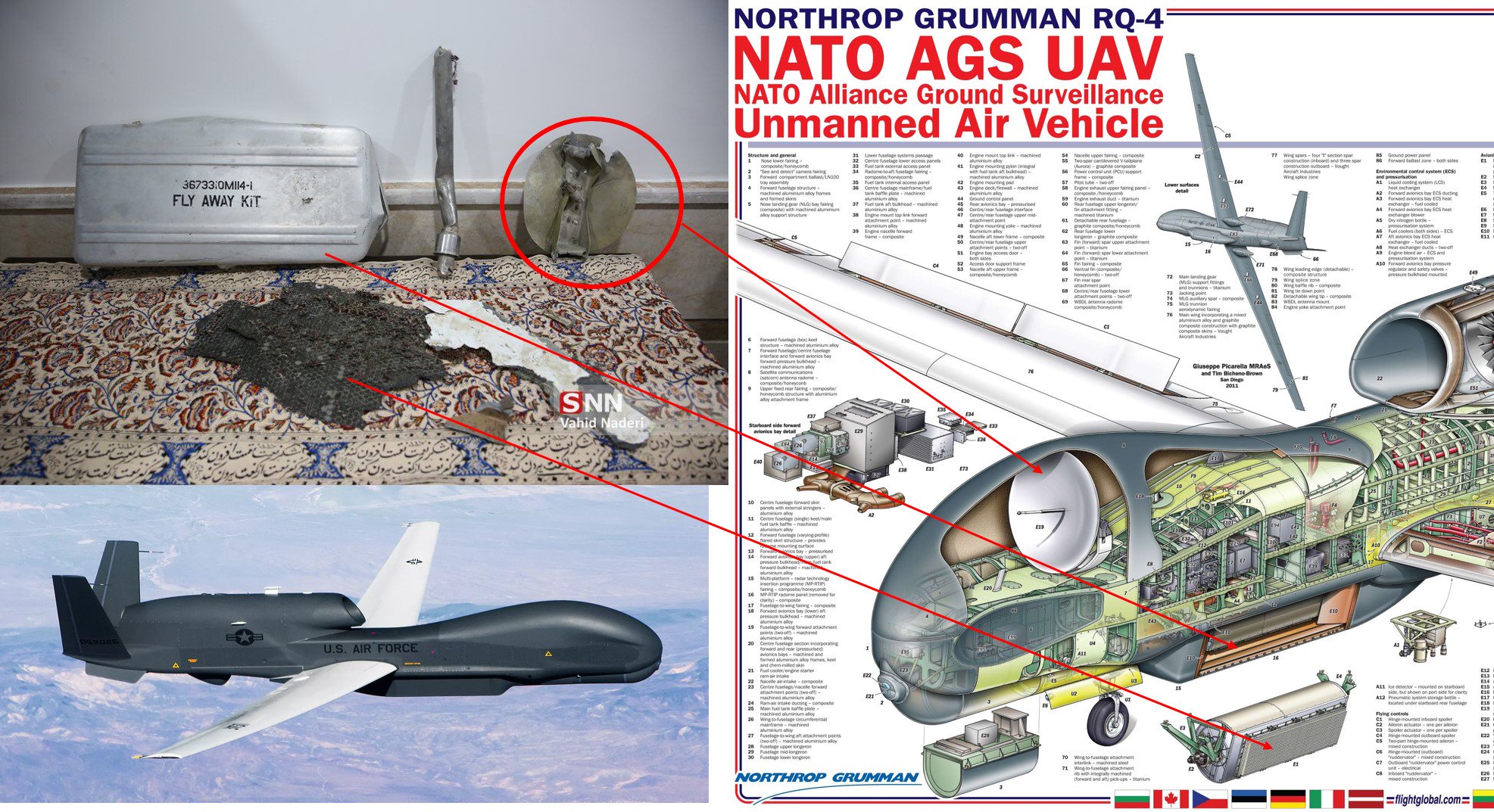 Фрагменты RQ-4 Global Hawk Фрагменты оборудования американского БПЛА RQ-4 Global Hawk сбитого иранской ПВО у побережья Ирана. На новых фотографиях демонстрируются фрагменты внутренних компонентов, которые выловили в море у побережья Ирана. В комментариях к фотографии неверно указан тип антенны.  Больше похоже вот на это. В любом случае, эти фото указывают на то, что в руки иранцев попали не только куски обшивки и фрагменты корпуса. По ряду сообщений в иранских соц.сетях, информация связанная с уцелевшими комплектующими RQ-4 была передана России или по другим данным - будет передана. Якобы, самое ценное, из уцелевшего - данные о новой модификации американского радара, который был установлен на сбитый беспилотник. И если это так, то эта информация поможет усовершенствовать современные российские системы РЭБ для борьбы с актуальными американскими авиационными и беспилотными комплексами. Все зависит от того, насколько сильно пострадало оборудование сбитого беспилотника и сколько из его содержимого иранцы смогли поднять со дна.  Фрагмент передачи на иранском телевидение. В студии выставили фрагмент крыла RQ-4. Надпись на фарси "Смерть Америке".  Фрагмент обшивки.   Депутаты парламента Ирана встречаются с офицерами КСИР, которые сбили американский БПЛА. Источник: https://colonelcassad.livejournal.com/5113868.html