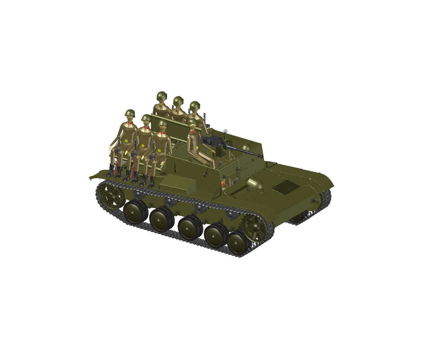 Минометы. Самые распространенные на войне орудия. Но в силу малого веса, шасси Т-26 избыточно. Берем Т-20 "Комсомолец".