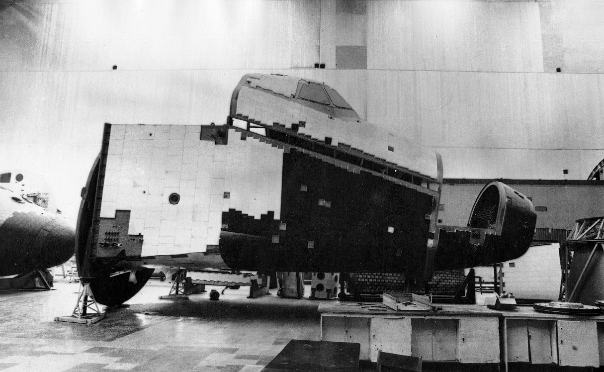 На самом деле там было пять вариантов номенклатуры грузов для транспортировки. 0ГТ(груз транспортировочный)-планер со снятым килем. 1ГТ-водородный бак блока Ц с носовым и хвостовым обтекателями. 2ГТ-двигательный отсек с аппаратурой и кислородный бак блока Ц с обтекателями. 3ГТ-возвращаемые на завод-изготовитель многоразовые элементы(обтекатели ,транспортировочные шпангоуты). 7ГТ-груз 3ГТ с размещенным внутри модулем кабины. На фото представлен именно вариант 7ГТ(конечно же без кабины челнока).