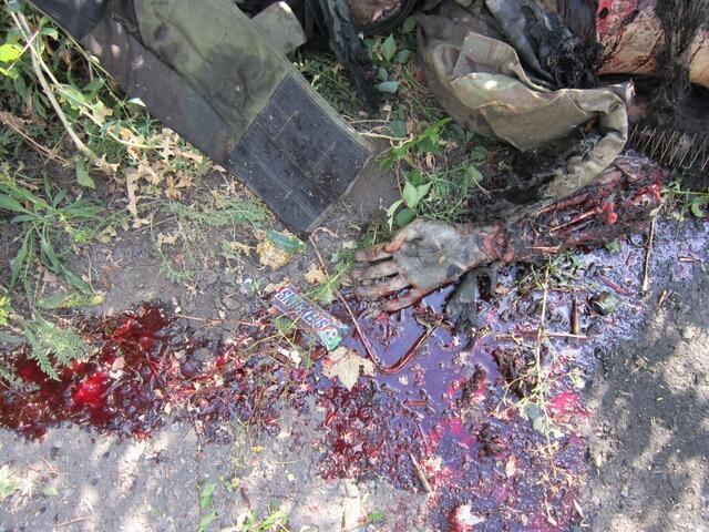 Ужасы войны. Строго 18+.  Цитата: Пленные десантники  Цитата: Кровавый след на земле, это след от солдата сил АТО, которого взрывом выкинуло с брони и он 10 метров полз в кусты со сломанной рукой и без стопы.  Цитата: Там и умер. Сникерс символизирует... http://colonelcassad.livejournal.com/17 ... l#comments