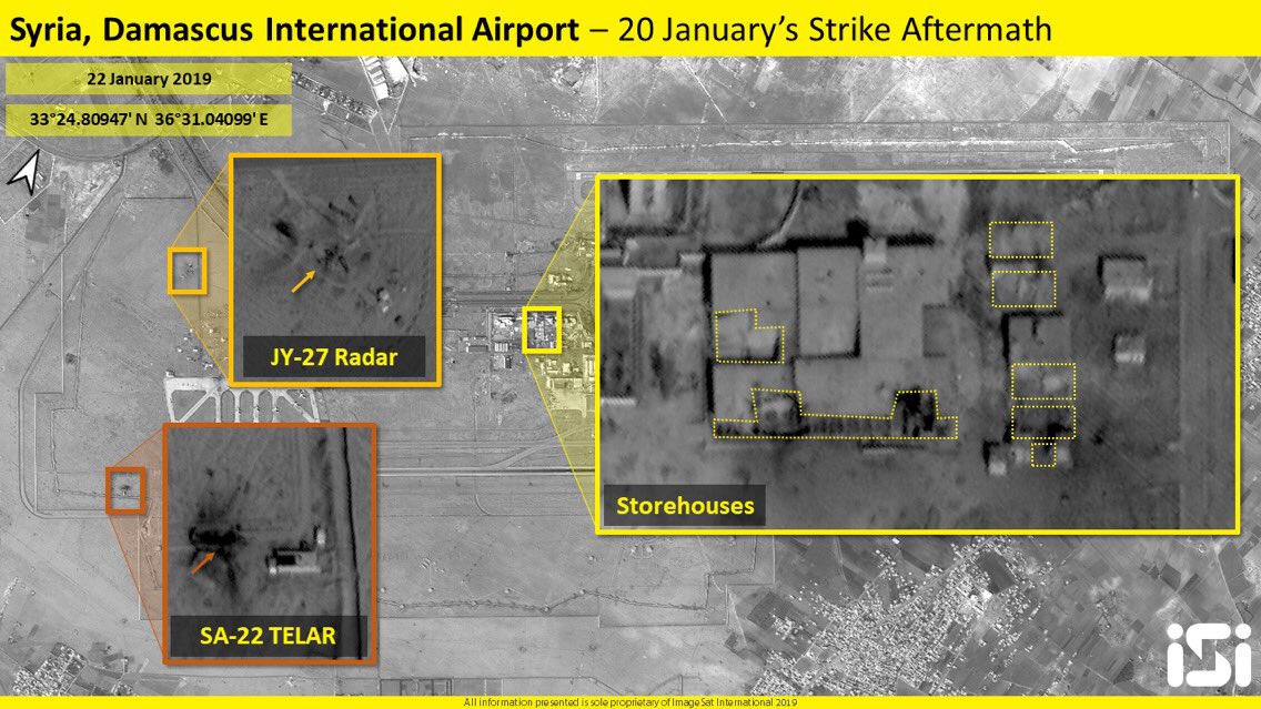 Спутниковые фото аэропорта Дамаска после израильской атаки Демонстрируется повреждение склада,место уничтожения "Панциря" и радарной системы JY-27    JY-27. Радарная станция китайского производства. Закупались Сирией незадолго до начала сирийской войны. Иранские официальные лица заявляют, что Иран никуда из Сирии уходить не собирается. так как находится там полностью законно с разрешения сирийского правительства. Для иллюстрации причин иранской уверенености - сводный список шиитских групп действующих в Сирии и на Ближнем Востоке (Ираке, Йемене, Ливане, Афганистане). Всю эту коллекцию Кассем Сулеймани собирал не одно десятилетие. Разумеется, с такими стратегическими активами обеспечивающими огромное влияние по всему Ближнему Востоку (стоит помнить, что Йемене хуситы контролируют столицу страны и ключевой порт, в Ираке шиитский блок входит в правящую коалицию, а в Ливане "Хезбалла" имеет сильное влияние на гос.структуры Ливана), потери от ударов Израиля для Ирана являются комариными укусами, отсюда и уверенность Ирана в том, что потоки оружия "Хезбалле" будут продолжать поступать, а влияние в Ираке, Сирии и Ливане позволит беспроблемно поддерживать работу стратегического шиитского моста ставшего одним из символов катастрофы ближневосточной политики США и Израиля. Более серьезную опасность для стратегии Ирана может представлять изменение стратегии США связанной противодействием иранской стратегии выдавливания США из Ирака, откуда официально США уходить не хотят. Первый раунд борьбы за влияние в Ираке США проиграли - мятеж в Басре направленный против иранского консульства и российских нефтянников провалился, проамериканский премьер Абеди не смог остаться на новый срок, давний оппонент Сулеймани Бретт МакГерк бесславно завершил карьеру под циничные комментарии Трампа, что он не знает этого человека, Россия частично заместила США в роли поставщика оружия для иракской армии, а новая правящая коалиция Ирака открыто ставит своей целью выдавливание американских войск. Но наличие контингента на территории Ирака, военных баз в рамках действующих договоров с прежним правительством, а также связей с барзанистами в Иракском Курдистане, оставляют для США возможность подкапываться под одну из опор шиитского моста, ведь если привести к власти в Багдаде анти-иранское правительство, это может решить многие проблемы США и Израиля в Сирии и Ливане. Так что в Ираке США пока что проиграли битву, но еще не войну и наверняка попробуют взять реванш у персов. Для этой стратегии уже даже название придумали "Стратегия Сирак" http://perevodika.ru/articles/1166487.html Другой вопрос, что эти планы достаточно очевидны и далеко не факт, что у США получится в Ираке то, что уже не получилось в Сирии. Впрочем, со стратегической точки зрения это в любом случае обещает больше проблем для Ирана (так как блок шиитов с садристами достаточно неустойчив в силу амбиций Ас-Садра), нежели истерики Израиля в Сирии, которая для Ирана является одним из фронтов идущей по всему региону прокси-войны, включая горячие войны в Сирии, Йемене и Афганистане. UPD: Появились фото результатов работы ПВО Сирии.     Источник: https://colonelcassad.livejournal.com/4 ... l#comments